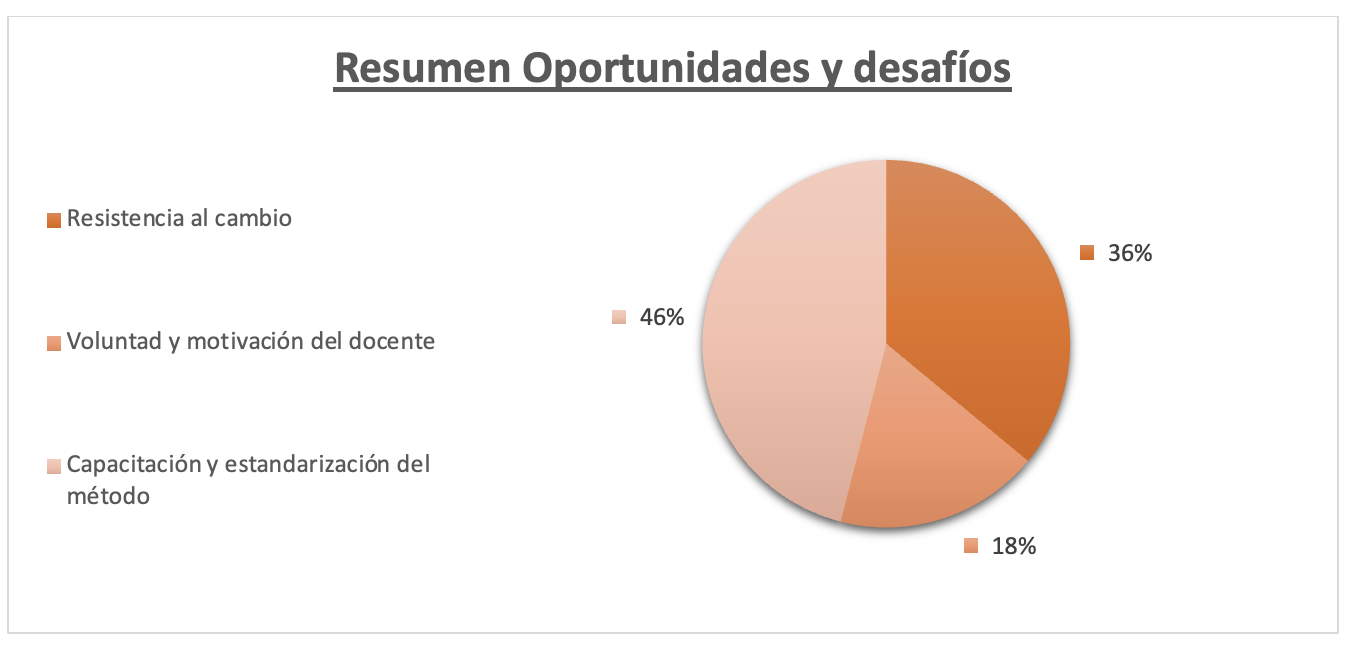 Según el grafico 4, en donde se presenta un resumen de los desafíos y oportunidades, el 46% de los docentes refieren como desafío que se necesita capacitación y estandarización del método Storytelling, para poder así unificar criterios y que los alumnos obtengan las mismas oportunidades de aprendizaje, un 36% menciona que la resistencia al cambio, por parte de algunos docentes sería un desafío importante a considerar, con un 18% comentan como oportunidad a la capacitación de este método activo y que la voluntad de querer aprender por parte del docente influye en la implementación de este método.